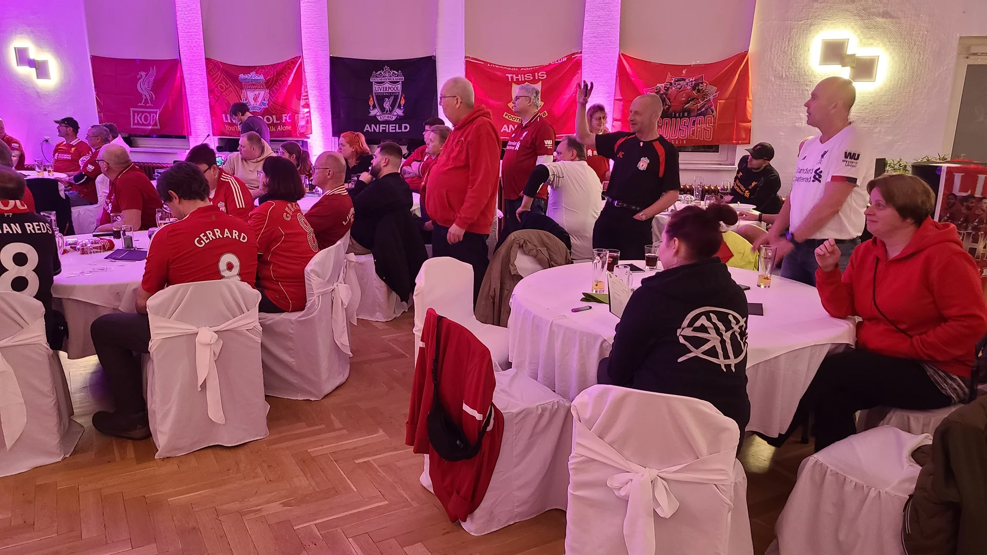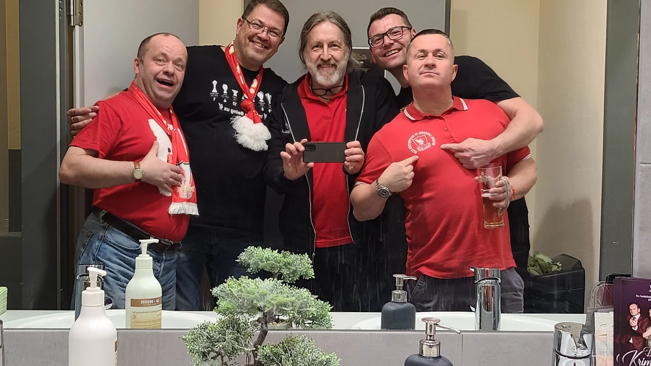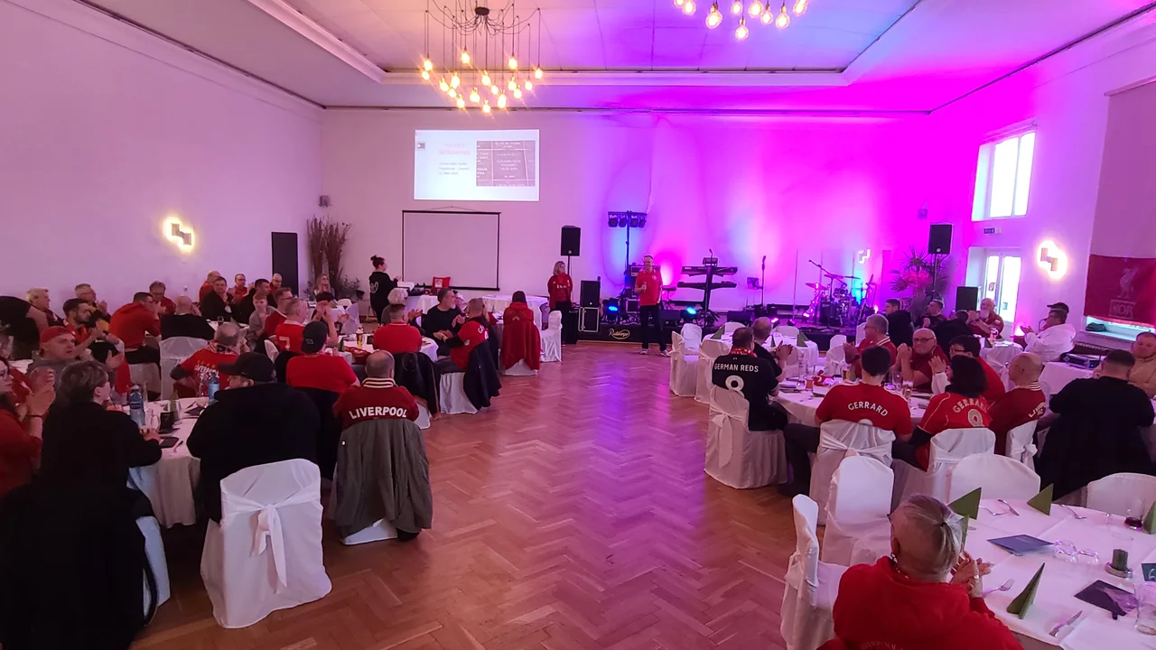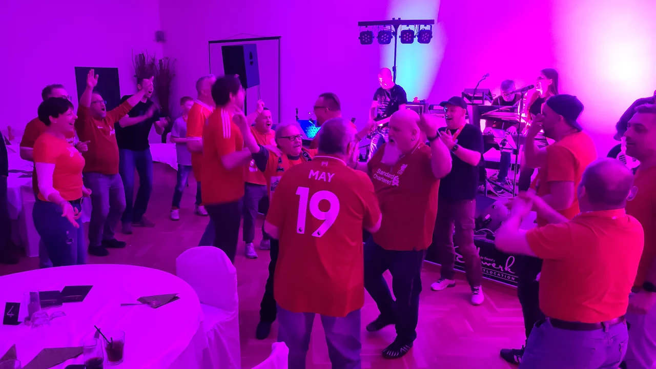So gestärkt, konnten wir gut in die erste Feierrunde starten, zu der „Get Wet rocks“ aus Freiburg im Breisgau erstmals nach Fürth 2022 wieder für uns performte und dabei wie gewohnt einige Liverpool-Chants gemeinsam mit uns anstimmte.