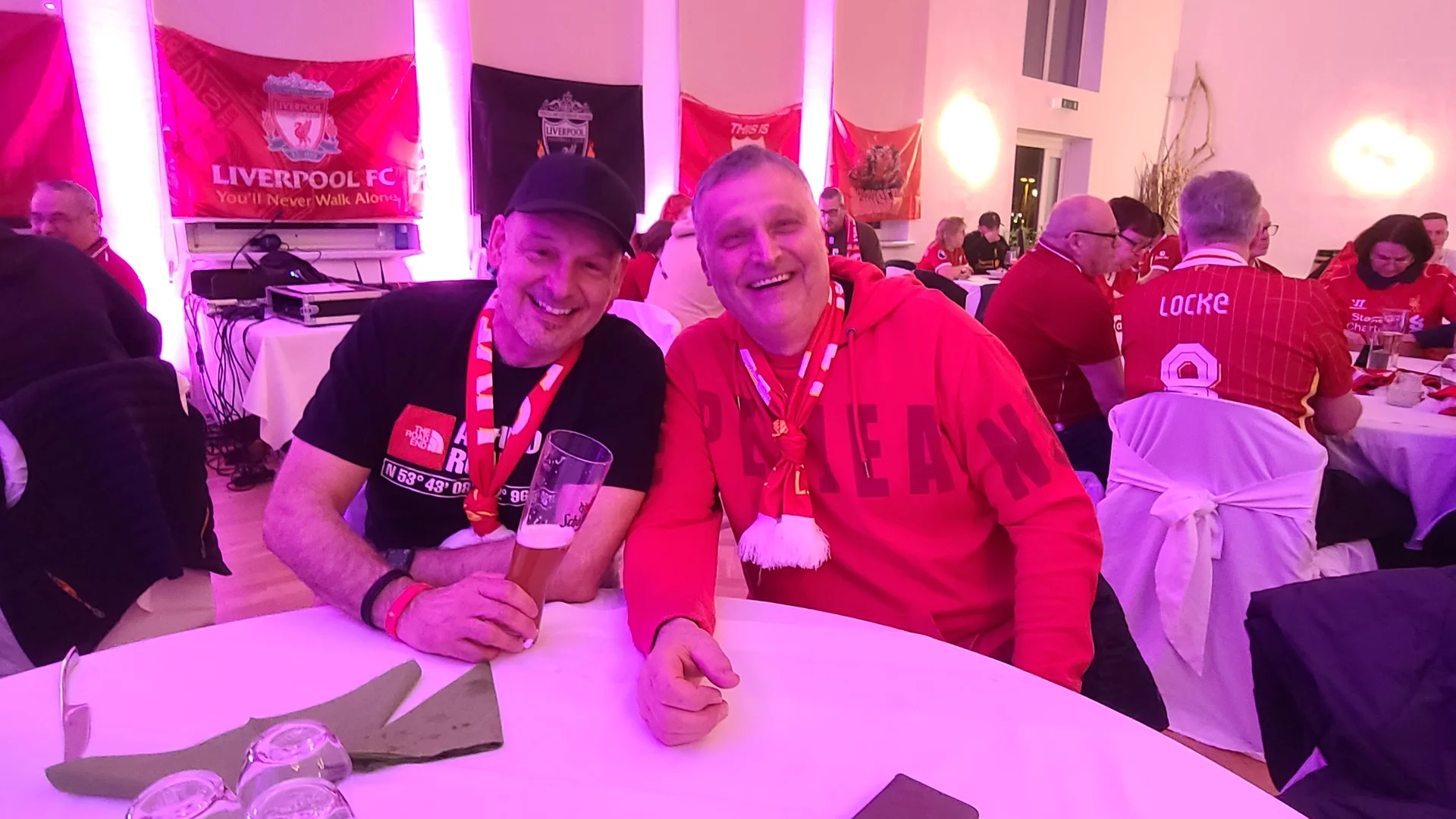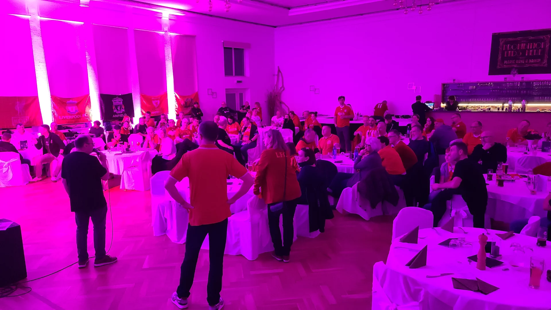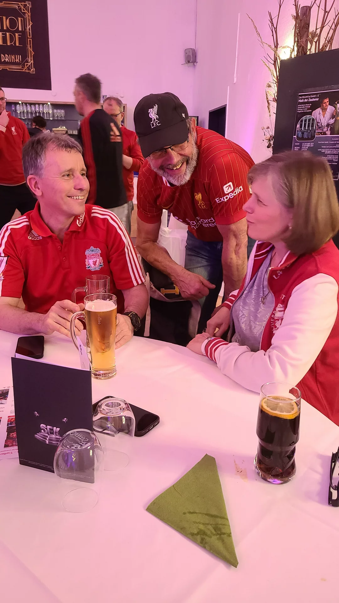 So gestärkt, konnten wir gut in die erste Feierrunde starten, zu der „Get Wet rocks“ aus Freiburg im Breisgau erstmals nach Fürth 2022 wieder für uns performte und dabei wie gewohnt einige Liverpool-Chants gemeinsam mit uns anstimmte.