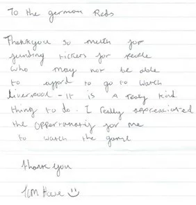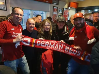 Im Nachgang der Premiere begannen wir die bis heute bestehende Zusammenarbeit mit der Spirit of Shankly Liverpool Supporters Union (SOS), deren Vorstandsmitglieder die Ticket-Nutzer auswählen, die von uns bei einem Treffen mit German Reds-Mitgliedern vor dem Kick off neben dem Anfield-Ticket jeweils einen German Reds-Schal zur Erinnerung erhalten.