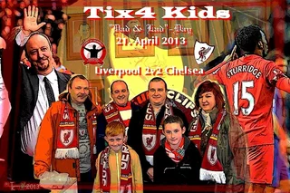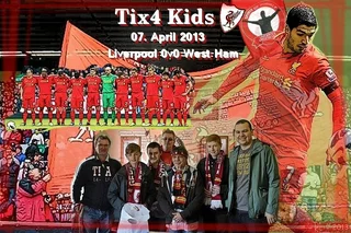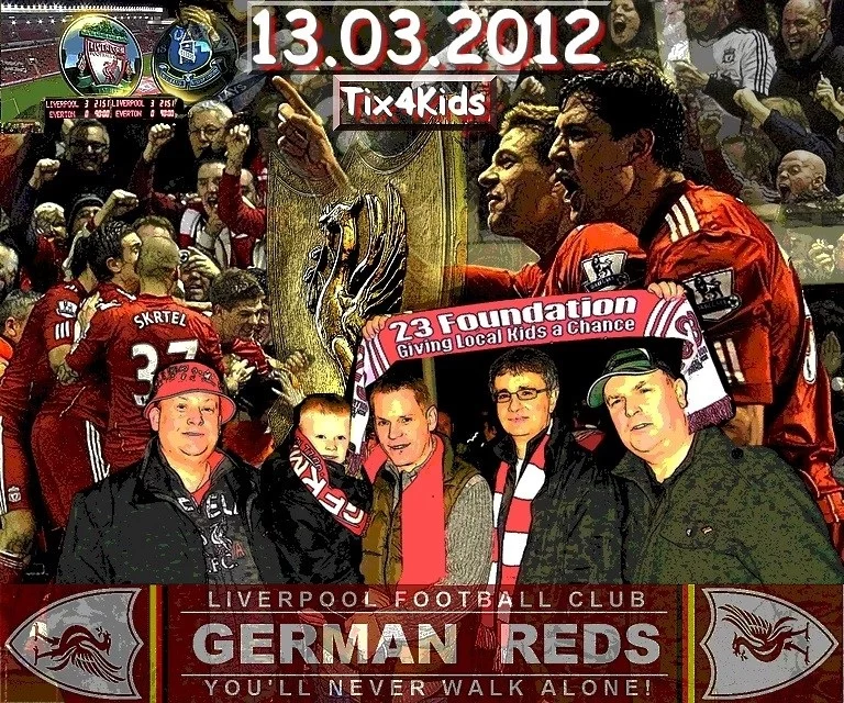 Noch Ende 2011 liefen die konkreten Planungen an und am 13. März 2012 war es endlich soweit, in Kooperation mit der „23 Foundation“ startete unsere erste „Tix4Kids“-Aktion mit zwei Tickets für das Merseyside-Derby gegen Everton, das unsere Reds mit 3:0 für sich entschieden!